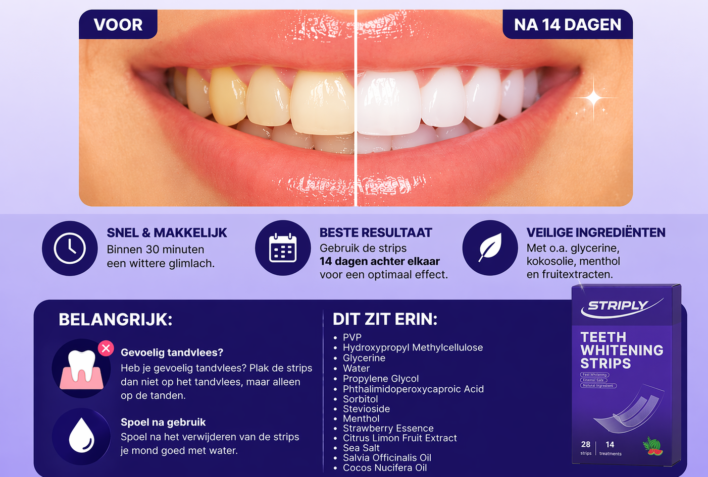 Elke verpakking bevat 28 strips, goed voor 14 treatments. Met deze combi deal kun je dus in totaal 8 weken gebruik maken.